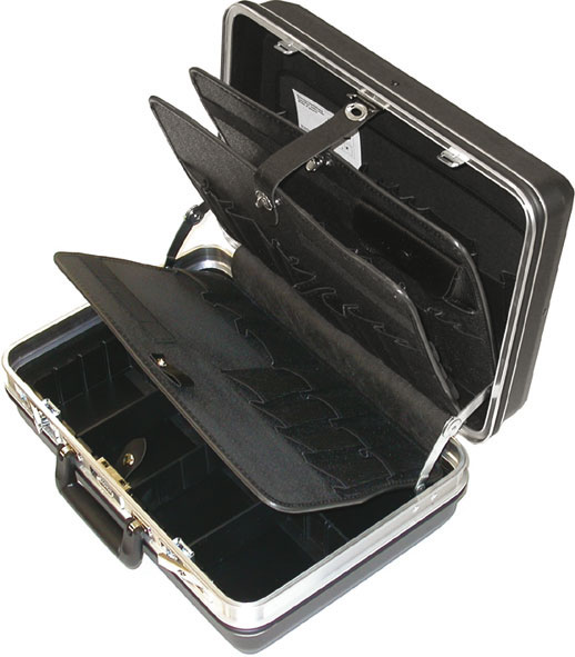 In robusto e leggero materiale ABS antiurto, rinforzate con telaio in alluminio, con bordi e spigoli arrotondati. Chiusura a 2 stabili serrature, con chiavi e combinazione. Robusta maniglia snodata. Corredata di 2 pannelli con 4 pareti ad alloggiamenti a tasca e a elastici, vaschetta con divisori regolabili, coperchio ad alloggiamenti e tasca porta-documenti. Peso Kg 4,9.