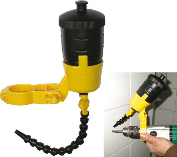 Leggero e funzionale garantisce l'esecuzione dei fori con il corretto raffreddamento delle punte, mediante acqua o liquido refrigerante. Da applicare al collare del trapano, fornito di beccuccio direzionabile mediante tubo snodato e rubinetto per garantire precisione ed evitare sprechi. Con valvola supplementare di sfiato per eventualmente interrompere il flusso del liquido senza agire sul rubinetto. Particolarmente utile nella foratura di piastrelle su pareti verticali. Indispensabile con le punte Art. 1334 GC, che necessitano grande raffreddamento.