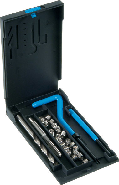 Ogni corredo contiene: una misura di inserti filettati nella quantità indicata, una punta in HSS per preforare, un maschio per filettare, un utensile per l'applicazione, un utensile per troncare. In cassetta.