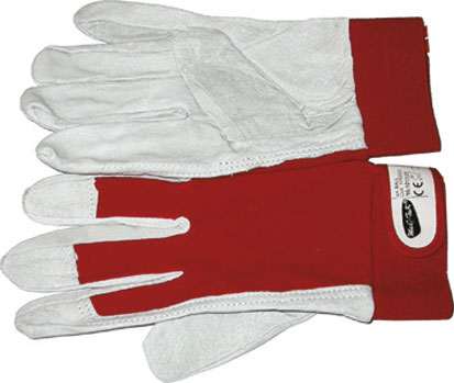 A 5 dita in pelle fiore con dorso in cotone felpato, maglia stringipolso elasticizzata con chiusura a velcro.