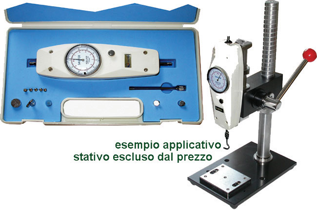 Tipo per misurazioni in trazione e in pressione, di elevata precisione e qualita'. A quadrante graduato con doppia scala in N e Kg. Doppia rilevazione: 1 per la misura continua (Track) - 1 per la misura dei valori di picco (Peak). Pulsante di azzeramento. Fornito con 6 accessori intercambiabili per un utilizzo universale (5 testine + 1 prolunga da mm 90). Incertezza di misura ± 1% del valore massimo. Peso Kg 0,560. Dimensioni mm 230x60x50. In valigetta.