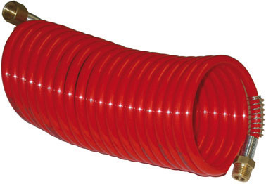 Tipo a spirale in PA 12 elastomerizzato, particolarmente flessibile ed elastico. Pressione max 15 atm. Fornito con raccordi filettati 1/4", femmina e maschio.