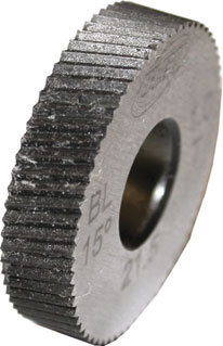 Tipo professionale secondo norme 403 per godronature a TAGLIO secondo DIN 82. Diametro mm 21,5. Spessore mm 5. Foro mm 8. In acciaio SUPER-RAPIDO HSS speciale, durezza HRC 62 (± 1). Facce laterali e fori rettificati. Fresatura fine dei denti.