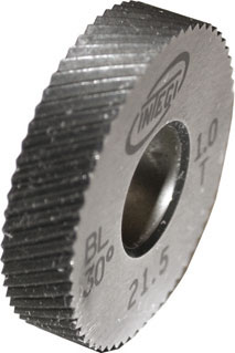Tipo professionale secondo norme 403 per godronature a TAGLIO secondo DIN 82. Diametro mm 21,5. Spessore mm 5. Foro mm 8. In acciaio SUPER-RAPIDO HSS speciale, durezza HRC 62 (± 1). Facce laterali e fori rettificati. Fresatura fine dei denti.