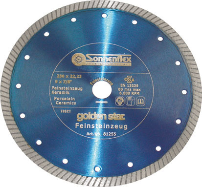 Tipo a taglio continuo diamantato a spessore sottile, con legante al COBALTO. Adatto per macchine portatili. Ad elevatissimo rendimento per tagliare ceramiche, gres porcellanato, piastrelle di ogni tipo di cottura, klinker, marmi e pietre naturali e artificiali. Foro Ø mm 22.