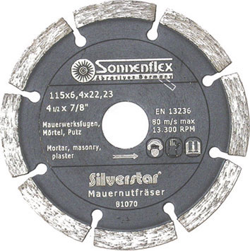 Tipo speciale a segmenti diamantati saldati a LASER. Particolarmente indicato per effettuare scanalature con macchine portatili (smerigliatrici e scanalatori), nei muri, pietre, calcestruzzi, ecc. Foro Ø mm 22.