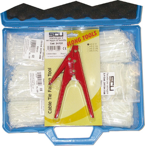 Colore BIANCO. Composizione: 1 pinza per fascette Art. 3473 T 1 conf. per tipo, largh. nastro mm 2,5, Art. 3473 H 75B - 100B 1 conf. per tipo, largh. nastro mm 3,6, Art. 3473 L 140B - 200B 1 conf. per tipo, largh. nastro mm 4,8, Art. 3473 M 200B - 250B - 280B. In valigetta di plastica.