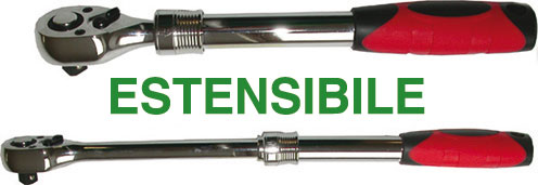 Tipo telescopico con lunghezza regolabile a 6 posizioni, da mm 300 a mm 445. In robusto tubo d'acciaio e impugnatura in materiale bicomponente per una presa sicura. Con levetta per movimento D + S e sistema di sgancio rapido, a pulsante. Attacco quadro 1/2".