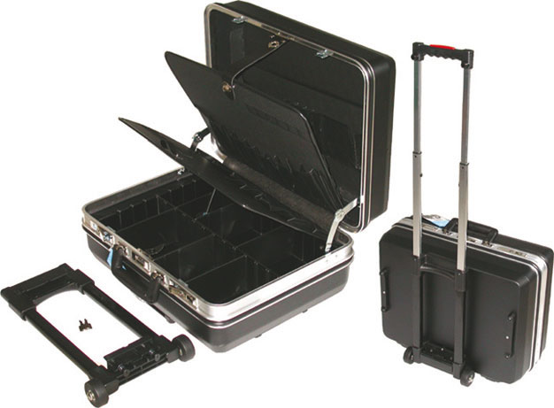 Con grande capacità di stivaggio, carrello con ruote gommate e asta telescopica con maniglia, sganciabile. In robusto e leggero materiale ABS antiurto, rinforzate con telaio in alluminio, con bordi e spigoli arrotondati. Chiusura a 2 stabili serrature, con chiavi e combinazione. Robusta maniglia snodata. Corredata di 1 pannello con 2 pareti ad alloggiamenti a tasca e a elastici, vaschetta con divisori regolabili, coperchio ad alloggiamenti e tasca porta-documenti.