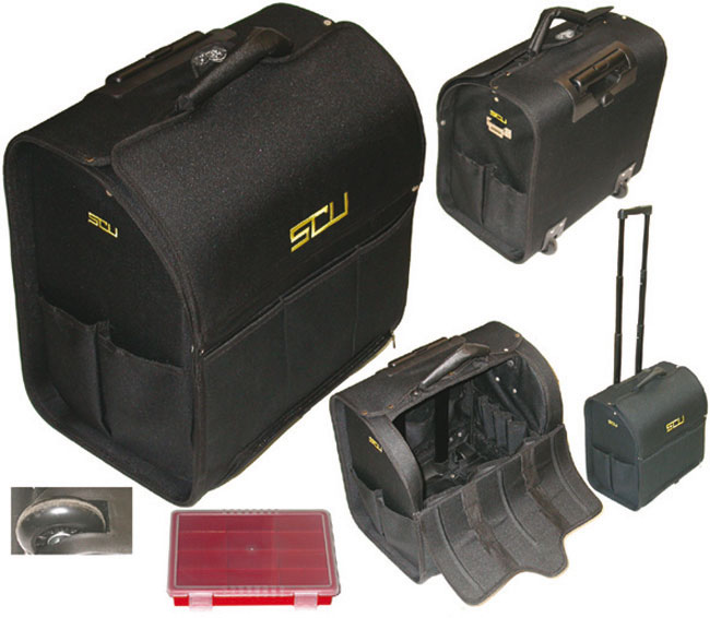 Corredato di grande vano centrale, con chiusura e 16 alloggiamenti interni per utensili. 7 tasche esterne per utensili e oggetti vari (cellulare, penne ecc.). Vano inferiore a cerniera lampo con cassetta in plastica, portaminuterie. Maniglia di trasporto imbottita. Peso Kg 4,3. Dimensioni mm 410x260x480h.