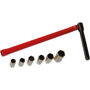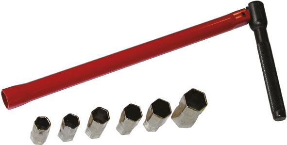 Con corpo tondo in robusta lamiera d'acciaio, leva snodata godronata in acciaio e bocca esagonale da mm 13. Complete di 6 bussole esagonali da mm 9-10-11-12-14-17 da montare sulla bocca esagonale e ganascia di presa per dadi di rubinetti.