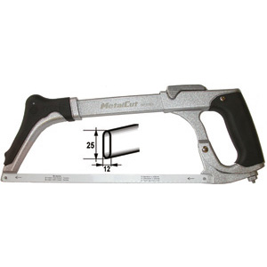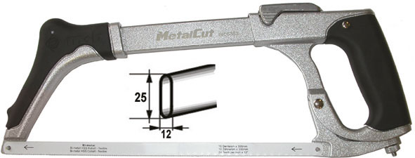 Tipo industriale, fisso, particolarmente robusto, rigido (tensione della lama fino a 190 Kg), ergonomico in acciaio speciale. Impugnatura e appoggiamano in gomma morbida per rendere la presa più efficace e comoda. Regolazione della tensione della lama mediante rotellina godronata, che fissa inizialmente la tensione desiderata. Bloccaggio/sbloccaggio rapido a leva per le successive operazioni di sostituzione della lama. Possibilità di tagli a 45°/90° rapidi e precisi. Fornito con 1 lama bimetallica a 24 denti per pollice.