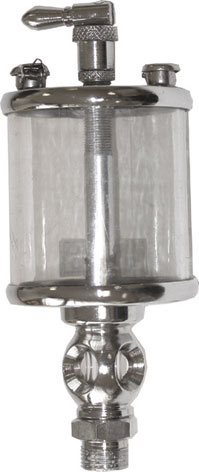 Corpo in ottone nichelato, serbatoio in plexiglass, perno filettato.