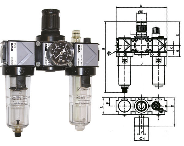 La tecnica ed i materiali dei componenti assicurano le migliori prestazioni di filtraggio-riduzione e lubrificazione dell’aria. Il filtro, il riduttore ed il lubrificante vengono montati nell’ordine indicato dalle frecce impresse sul gruppo. Bicchieri in policarbonato trasparente, infrangibile, a sgancio rapido, per resistere a temperature fino a 50 °C e a pressioni fino a 16 bar. Con dosatore dell'olio in policarbonato.