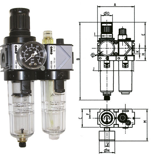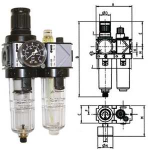 Gruppi di 2 unità. Tipo compatto per lo sfruttamento di spazi ristretti. Costruzione di nuova concezione modulare. Bicchieri in robusto policarbonato trasparente, infrangibile, a sgancio rapido, per temperature fino a 50 °C e pressioni fino a 16 bar. Con dosatore dell'olio in policarbonato. Con scala manometro da 0 a 16 bar (Atm). Capacità di regolazione da 1 a 10 bar (Atm). Porosità del filtro in polietilene µm 40.
