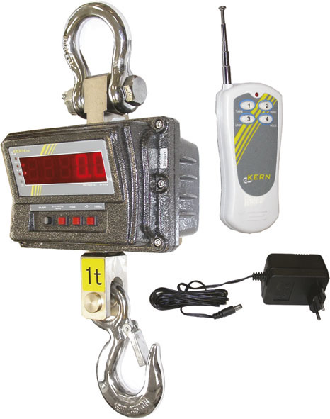 Tipo digitale con telecomando, molto robusto, per usi gravosi, con requisiti di prova e sicurezza secondo le norme Europee EN 13155 / en 61010 e norme tedesche TÜV-GS. Con display LCD retroilluminato, a 5 digit (alt. cifre mm 30), con tasto HOLD di lettura prolungata del peso, tasto "0" relativo per azzeramenti a bilancia carica, tasto ON/OFF per accensione, spegnimento. Funzionamento con accumulatore interno, autonomia 100 ore ca., tempo di ricarica 14 ore ca., tramite alimentatore 230 V, in dotazione. Precisione: ± 0,2% sul valore di fondo scala. Fornito con grillo superiore, larghezza interna mm 66/73 (per tipo 1000/3000) e gancio girevole con fermo di sicurezza, apertura utile mm 40. Altezza totale con grillo e gancio mm 610. Peso Kg 16 ca.