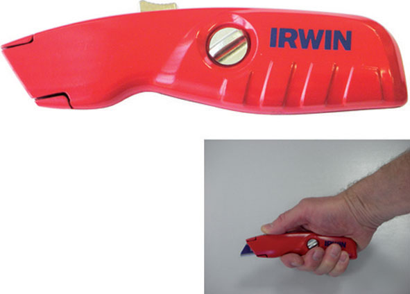 Tipo con sistema antinfortunistico. Rientro della lama automatico non appena l'operatore rilascia l'apposito cursore.Per tagliare linoleum, cartone, cuoio, legni compensati, plastica ecc.