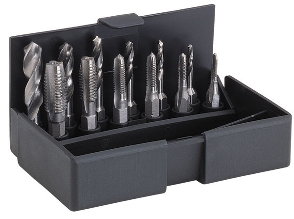 Contenuto:1 pz. per misura maschi Art. 9092 Ø mm 3-4-5-6-8-101 pz. per misura punte Art. 8665 Ø mm 2,5-3,3-4,2-5-6,8-8,51 pz. attacco magnetico da 1/4 esagonale . In astuccio di plastica.