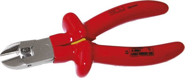 Utensili in acciaio temprato. Impugnatura a forte spessore, rossa, isolata fino a 1000 Volt con marchio di prova VDE, IEC 60900, dove indicato. Le pinze e i tronchesi hanno doppio rivestimento, interno giallo, esterno rosso.