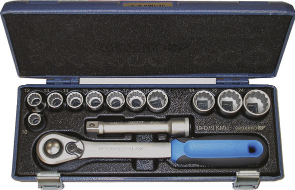 Contenuto 13 utensili.Composizione:11 bussole poligonali Art. 969 RB mm 10 - 12 - 13 - 14 - 15 - 16 - 17 - 18 - 19 - 22 - 241 prolunga Art. 970 RF mm 1251 leva a cricco con levetta, sgancio rapido, Art. 970 RTB mm 270Assortimento completo.