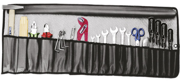 Composto di: 27 utensili 1 borsa Art. 2076 GE 6 chiavi fisse Art. 870 GR, da mm 6x7 8x9 10x11 12x13 x14x15 16x17 8 chiavi in serie Art. 914 GM 8 da mm 2 2,5 3 4 5 6 8 10 1 pinza universale Art. 320 G da mm 180 1 pinza regolabile Art. 365 GE 240 1 tronchese Art. 569 da mm 160 1 forbice Art. 656 A 1 giravite Art. 1970 GA da mm 100 1 giravite Art. 1970 GE da mm 150 1 giravite Art. 1970 GP - PH 1 1 giravite Art. 1970 GP - PH 2 1 giravite cercafase Art. 1907 GA 1 martello Art. 2702 F da g 200 1 coltello Art. 5231 G 1 doppiometro Art. 4141 Assortimento completo.