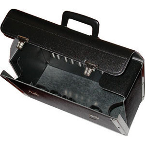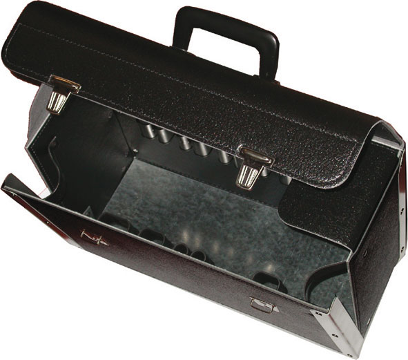 Tipo a valigetta con maniglia. In cuoio, chiusure a scatto con chiavi. Con fondo e bordi laterali rinforzati in lamiera. Ampio vano centrale con alloggiamenti regolabili. Parete frontale apribile per un pratico prelievo. Attacchi per cinghie di trasporto. Peso kg 2,2.