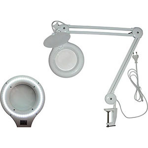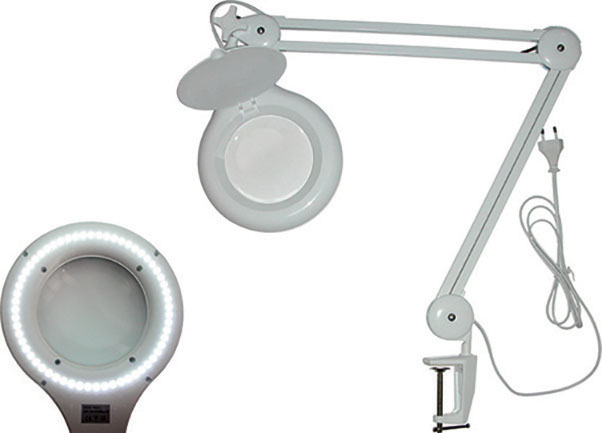 Luce con 60 LEDS. Tipo con attacco a morsetto. Montatura in metallo con bracci a pantografo e snodi compensati a frizione. Non adatte per illuminare superfici riflettenti o irregolari. Sviluppo bracci cm 80. Collegamento a rete 100-240 V. Lente in cristallo ottico con ingrandimenti 2,25x (5 diottrie). Diametro lente mm 120.