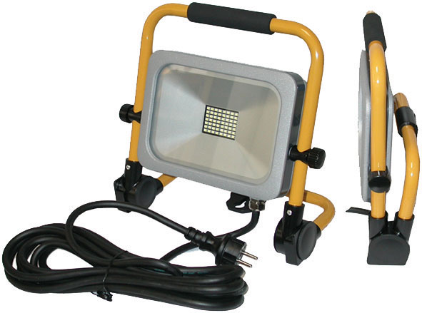 Tipo portatile e robusto a tecnologia SMD LED di grande efficienza e risparmio energetico (10 volte meno di proiettori alogeni), a elevata luminosità e lunga durata fino a 50.000 ore. Portalampada in alluminio e acciaio. Telaio in stabile tubo d'acciaio, impugnatura in gomma, richiudibile per un facile stivaggio. Lampada orientabile. Protezione contro polvere e spruzzi d'acqua (IP 65). Completo di cavo e spina SCHUKO da 220-240 V.