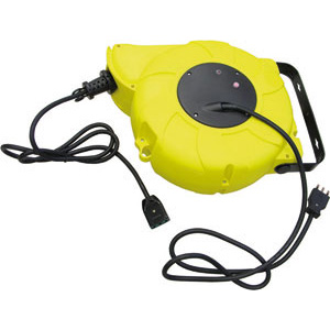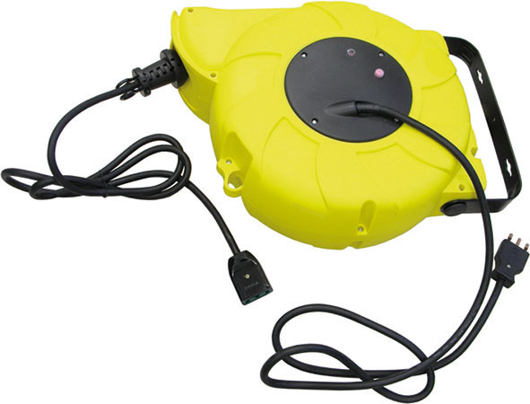 Tipo pesante professionale, in robusto materiale plastico. Potente molla a spirale, a forte propulsione, con dispositivo di arresto a molla disattivabile. Montaggio a parete e a soffitto, orientabile. Protezione anti-surriscaldamento con spia di controllo rossa. Completo di cavo flessibilie ad elevato scorrimento, con presa 16 A, cavo di allacciamento e spina 16 A, 250 V.