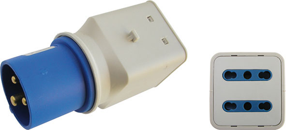 Adattatore con 1 spina CEE a 3 poli (2 fasi 230 V + terra) 16 A e 2 prese bipasso 10 A/16 A.