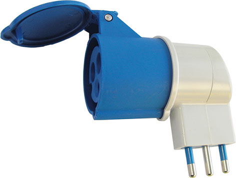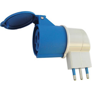 Adattatore con 1 spina monopasso 16 A e 1 presa CEE a 3 poli (2 fasi 230 V + terra) 16 A.
