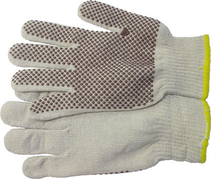 Tipo a 5 dita, in filo continuo di cotone, con polsino elasticizzato.Palmo puntinato in PVC per una presa più sicura.Taglia 9. Conformi alle vigenti norme Europee.