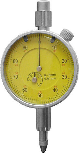 Divisione 1/100. Con 2 lancette per l’indicazione dei millimetri e dei centesimi di millimetro. Con indici di tolleranza.Azzeramento mediante rotazione del quadrante e vite di fermo. Cassa metallica.
