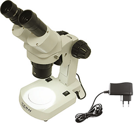 Microscopio binoculare particolarmente stabile, robusto, con supporto scatolato di facile e preciso utilizzo particolarmente indicato per laboratori, officine di meccanica fine, scuole di formazione specializzate, ecc. Prestazioni ottiche di elevata qualità, grande campo visivo, luce a LED, meccanica di precisione. Stativo a regolazione fine. Sistema ottico: Greenough a 45°. Distanza interpupillare: mm 55 a 75. Oculare: 10x Ø 20 mm. Obiettivo: 1x/2x/4x. Ingrandimenti: 10x/20x/40x Campo visivo Ø: mm 20/10/5 Doppia illuminazione: a LED 0,21 W,e 1 W, 240 V-50 Hz. Peso netto Kg 3. Ø punto appoggio oggetti mm 74,5. Dimensioni mm 220x140x330h.