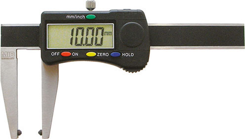 In acciaio inossidabile, temprato. Lettura diretta su display, con grande altezza cifre per una lettura facilitata. Tasto di azzeramento per misure relative e comparate, tasto di accensione e spegnimento. Tasto di conversione mm/poll. Con vite di fermo. Alimentazione con batteria 1,5 V. Lettura 0,01 mm. Con funzione supplementare "HOLD" (MEMORIA). Punte di contatto fisse. Apertura utile mm 0-50, lunghezza becchi mm 50.