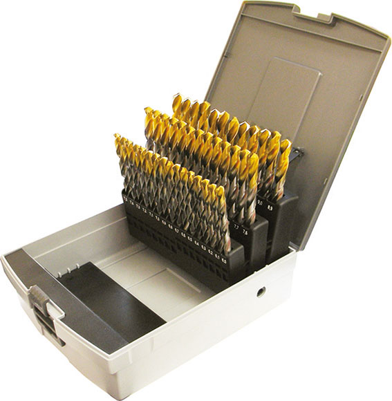 Assortimenti in robusta cassetta in ABS infrangibile.Con punte cilindriche Art. 8418 G in acciaio HSS con punta rivestita TIN.L’assortimento completo.