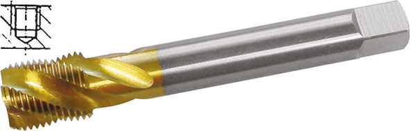 HSS-E. Imbocco corto. Tipo con elica a circa 35° per metalli fino a R 900 N/mm², acciai legati e non legati. Fori ciechi profondi. Con rivestimento TIN.