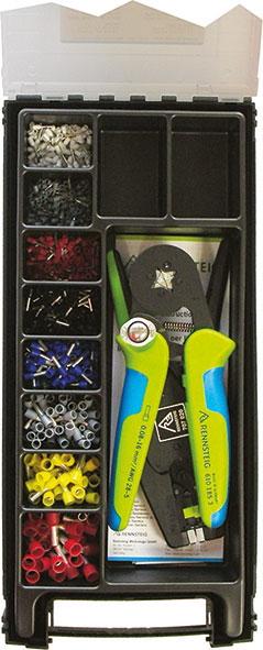 Assortimento di 800 terminali a bussola completi di pinza per crimpare a regolazione automatica Art. 207 GV e pinza spelafili a regolazione automatica Art. 193 GH. Confezione indicata per professionisti specializzati e industria: 150 pezzi per tipo terminali a bussola Art. 208 0,5 - 0,75 100 pezzi per tipo terminali a bussola Art. 208 1 - 1,5 - 2,5 - 4 50 pezzi per tipo terminali a bussola Art. 208 6 - 10
