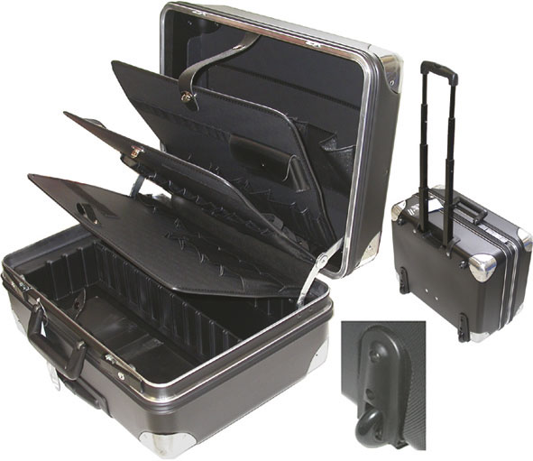 Tipo industriale, con ruote integrate su cuscinetti a sfera, gommate e resistentissime. Sistema telescopico, regolabile, per un comodo traino. In materiale plastico di ultima generazione HDPE estremamente più robusto ed elastico. Antiurto, indeformabile, rinforzato con speciale telaio doppio in duralluminio. Bordi e spigoli arrotondati con placche in metallo di rinforzo e protezione. Chiusura ermetica a 2 serrature in acciaio, con chiavi, combinazione e 3 cerniere. Robusta maniglia ergonomica, snodata, avvitata per una eventuale semplice sostituzione. Corredata di 2 pannelli con 4 pareti ad alloggiamenti elastici e a tasca, 1 vaschetta profonda con divisori regolabili e coperchio con alloggiamenti elastici e a tasca. Pannello porta-calcolatrice, blocchetti, documenti e penne. Peso kg 7,3. Portata fino a kg 40. Idonee anche per il trasporto in aereo.