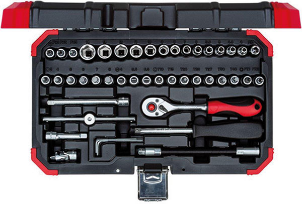 Contenuto 46 utensili. Composizione: 13 bussole esagonali mm 4 - 4,5 - 5 - 5,5 - 6 - 7 - 8 - 9 - 10 - 11 - 12 - 13 - 14 6 bussole con esagono esterno da mm 3 - 4 - 5 - 6 - 7 - 8 3 bussole a giravite taglio diritto da mm 4 - 5,5 - 6,5 3 bussole a giravite taglio a croce PH 1 - 2 - 3 2 bussole a giravite taglio a croce PZD 1 - 2 7 bussole a giravite con impronta esterna TORX da T10 - 15 - 20 - 25 - 27 - 30 - 40 2 prolunghe fisse da mm 50 - 100 1 prolunga flessibile da mm 150 1 leva scorrevole 1 snodo a cardano 1 asta portabussole con impugnatura 1 adattatore a bussola per inserti, attacco quadro 1/4", attacco esagonale 1/4" 1 leva a cricco con levetta e sgancio rapido 4 chiavi per esagoni interni da mm 1,27 - 1,5 - 2 - 2,5 Assortimento completo.