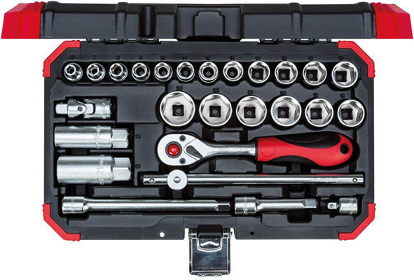 Contenuto 26 utensili. Composizione: 18 bussole esagonali mm 6 - 7 - 8 - 9 - 10 - 11 - 12 - 13 - 14 - 15 - 16 - 17 - 18 - 19 - 20 - 21 - 22 - 24 2 bussole per candele da mm 16 - 21 1 leva a cricco con levetta e sgancio rapido 2 prolunghe fisse da mm 75 - 150 1 leva scorrevole 1 snodo a cardano 1 bussola di riduzione attacco quadro da 3/8" a 1/4" Assortimento completo.