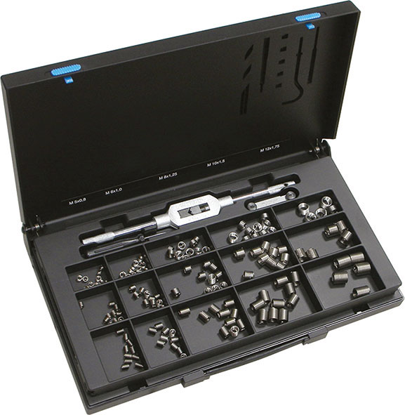 Contenuto: 10 pz. per misura inserti Art. 9500 G 5x0,8/5x0,8A/5x0,8B/6x1/6x1A/6x1B/8x1,25/8x1,25A/8x1,25B/10x1,5/10x1,5A/10x1,5B 5 pz. per misura inserti Art. 9500 G 12x1,75/12x1,75A/12x1,75B 5 punte in HSS mm 5,2/6,3/8,3/10,4/12,4 5 pz. maschi Art. 9501 G 5x0,8/6x1/8x1,25/10x1,5/12x1,75 5 pz. utensili applicatori Art. 9502 GA Gr. 8/9/11/13/15 5 pz. utensili troncatori Art. 9502 GB Gr. 8/9/11/13/15 1 pz. giramaschi Art. 9476 G 2 1 pz. contafiletti In cassetta.