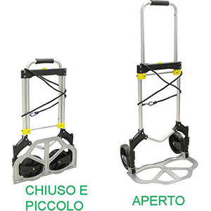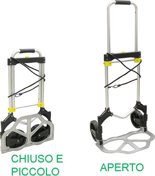 Tipo pieghevole, in alluminio e materiale plastico. Con maniglia allungabile, telescopica, altezza max mm 1065. Adatto per il trasporto di borse, valigie, cassette, bauletti portautensili ecc. Portata max Kg 80 c.ca. Diametro ruote mm 175. Dimensioni aperto mm 490x450x1065h. Dimensioni carrello chiuso mm 490x55x825h. Peso Kg. 4,8.
