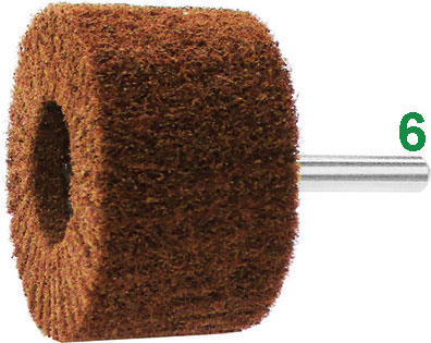 Tipo con fibra in materiale sintetico e superficie abrasiva per ottenere una finitura satinata. In corindone, per satinare leghe al Cr-Ni, leghe leggere, metalli dolci, alluminio e legno. Colore rosso. ATTACCO Ø mm 6.