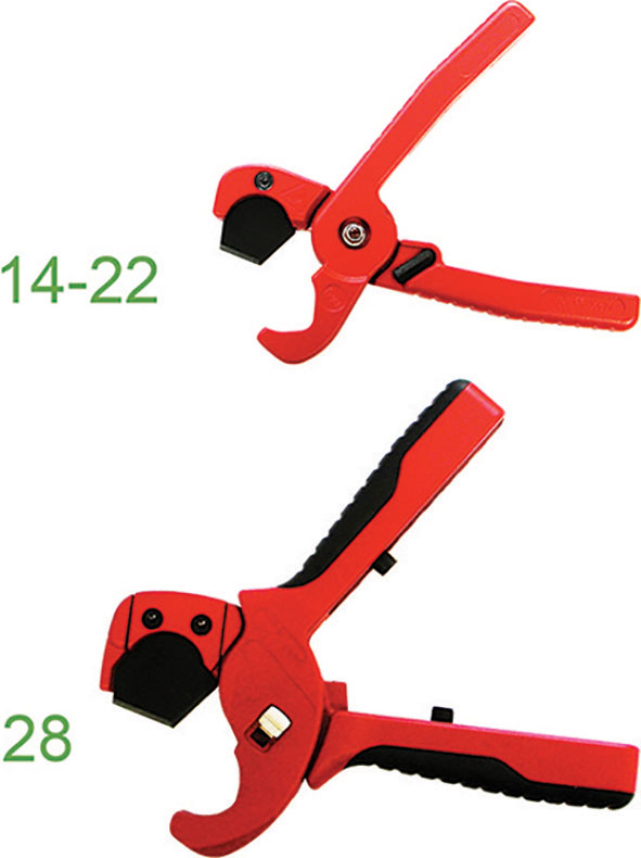 Tipo a pinza, professionale con coltello in acciaio speciale temprato e affilato, con ottimale geometria di taglio e ricoperto in PTFE. Ideali per il taglio netto senza deformazioni di tubi rigidi o flessibili in plastica, PVC, PE, nylon, ecc., anche con rinforzo in plastica o tessile. Apertura a molla con sistema di blocco a una mano. Robusta cerniera registrabile (Art. 1052 C 28 con cerniera doppia a incastro e impugnature rivestite in morbida gomma antiscivolo).