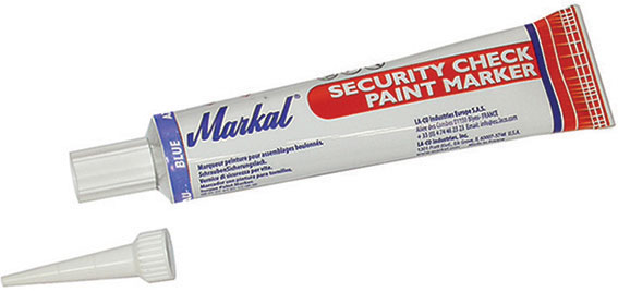 Tipo a tubo con cappuccio dispenser. Vernice ad alta visibilità per un controllo visivo immediato di inviolabilità su pezzi assemblati con viti, dadi, bulloni che non devono essere svitati accidentalmente o per intervento doloso.