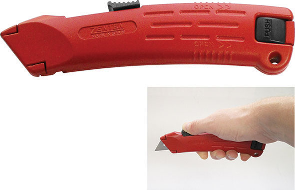 Tipo con sistema antinfortunistico. Rientro della lama automatico non appena l'operatore rilascia l'apposito cursore.Per tagliare linoleum, cartone, cuoio, legni compensati, plastica ecc.