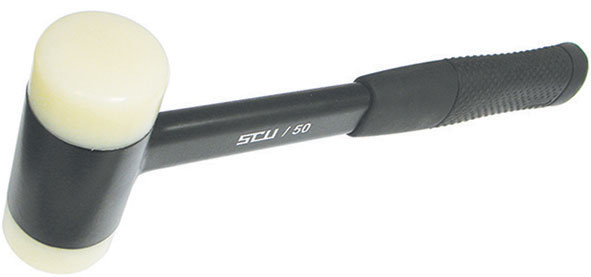 Con teste intercambiabili, in poliuretano bianco. NON ADATTE PER BATTUTA SU CORPI SPIGOLOSI.Manico in ferro e impugnatura in gomma antiscivolo.