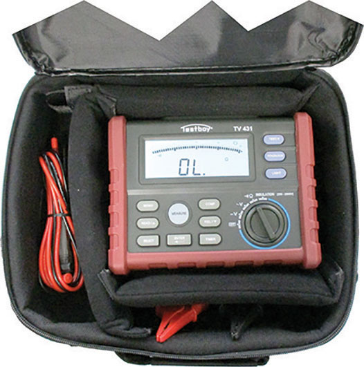 Tipo elettronico digitale a multifunzioni, con lettura su display, per la misurazione della resistenza di isolamento di apparecchiature elettriche, interruttori, cavi, motori, generatori con tensione di prova 250 V, 500 V, 1000 V, 2500 V. Funzioni supplementari: test di continuità e misurazione di tensione in corrente continua (DC) e alternata (AC). Indicatore livello carica batteria. Spegnimento automatico in caso di inattività e funzione Data Hold. Capacità di misurazione test di isolamento: 0,01 Mohm fino a 100 Gohm. Precisione: 0-2000 Mohm ±3% + 5 digit (250 - 500 - 1000 - 2500 V) 2000 Mohm fino a 20 Gohm ±5% + 0,2 Gohm (2500V) 20-100 Gohm ±10% + 2 Gohm (2500 V) Corrente di prova: 3 mA. Quando la resistenza è inferiore a 3 Mohm si attiva un segnale acustico. Misurazione di tensione: 0-1000 V in DC 0-750 V in AC Precisione: ±0,5% + 5 digit in DC ±1,5% + 5 digit in AC Alimentazione: 6 batterie alcaline da 1,5 V tipo LR14 (Art. 3600 F), in dotazione. Con 2 puntali di misurazione e 2 morsetti.