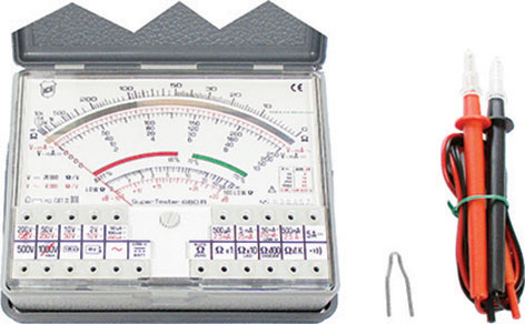 Tipo analogico, professionale, classe 2. Con test diodi e transistor, test di continuità con segnale acustico, tensione di prova, prova LED e test batterie (1,5 V e 9 V). Tensione/Corrente continua: portata 100 mV a 1000 V/50 µA a 5 A. Tensione/Corrente alternata: portata 10 V a 750 V/250 µA a 2,5 A. Resistenza: portata 0 ohm a 10 Mohm Resistenza (Low Ohm): portata 0 a 500 ohm Alimentazione: 1 batteria alcalina a 9 V (Art. 3600 M), in dotazione.